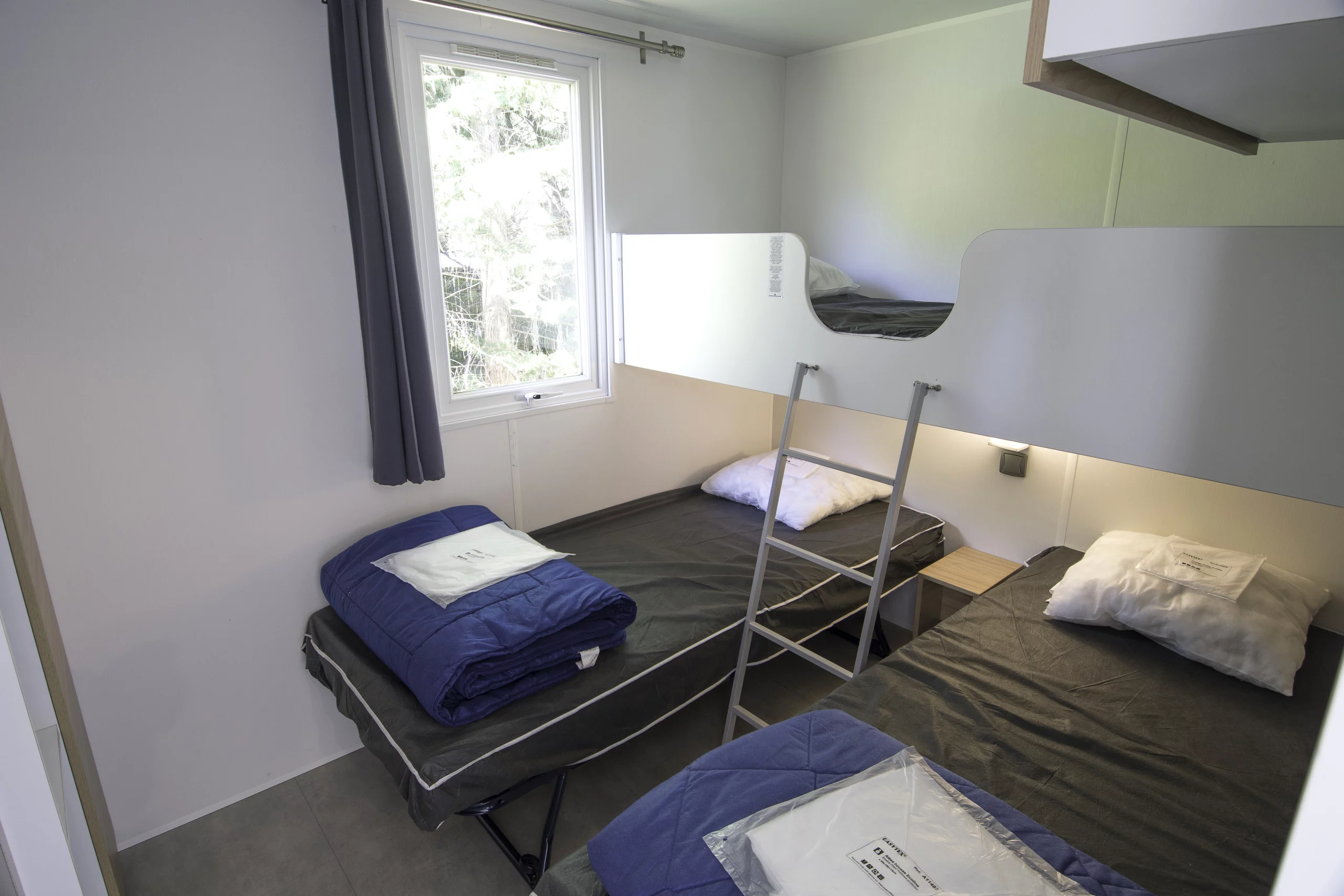 La chambre parentale dispose d’un lit en 140 et l’autre chambre comprend trois lits en 80, dont un gigogne. Les couettes et taies d’oreiller sont comprises.
