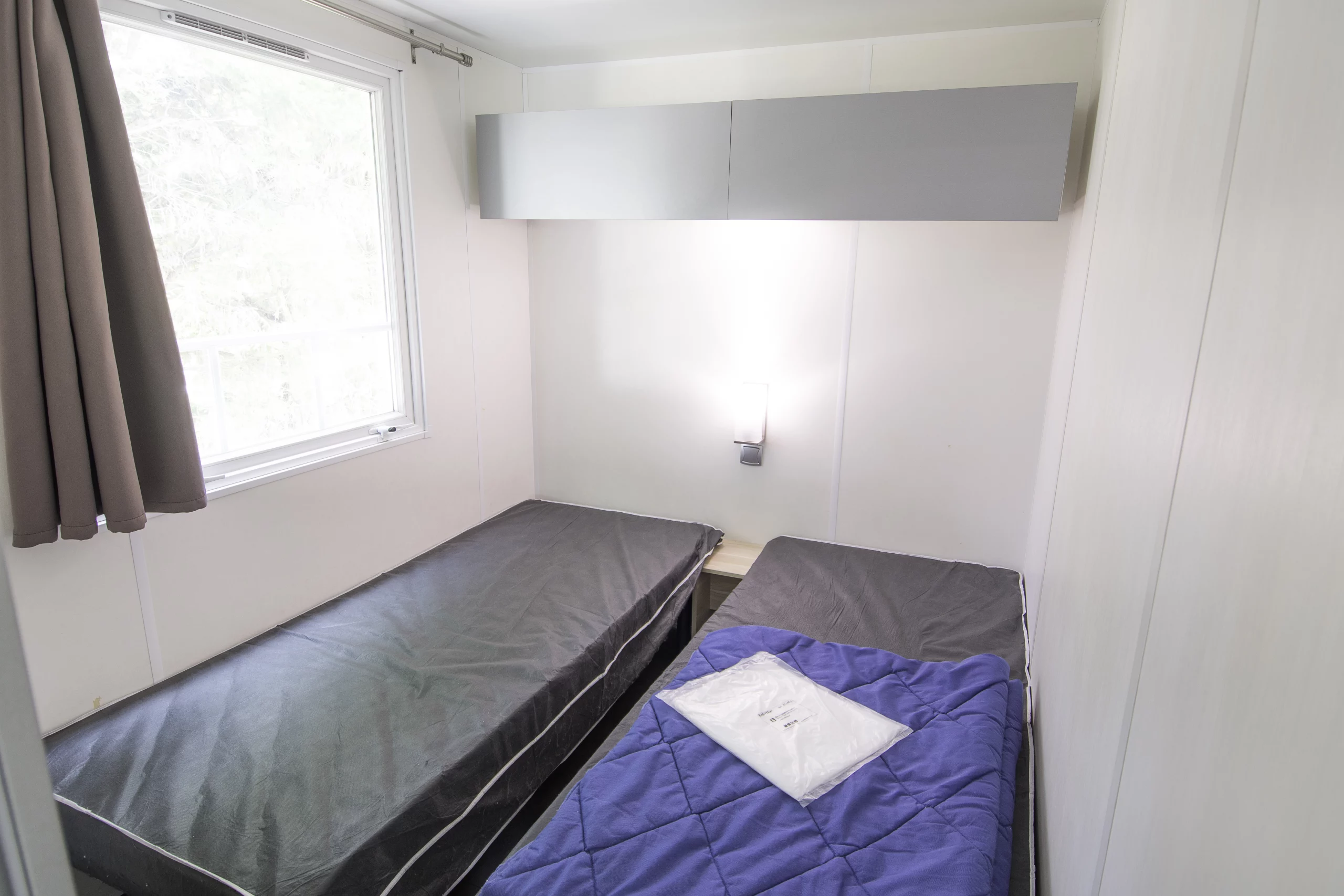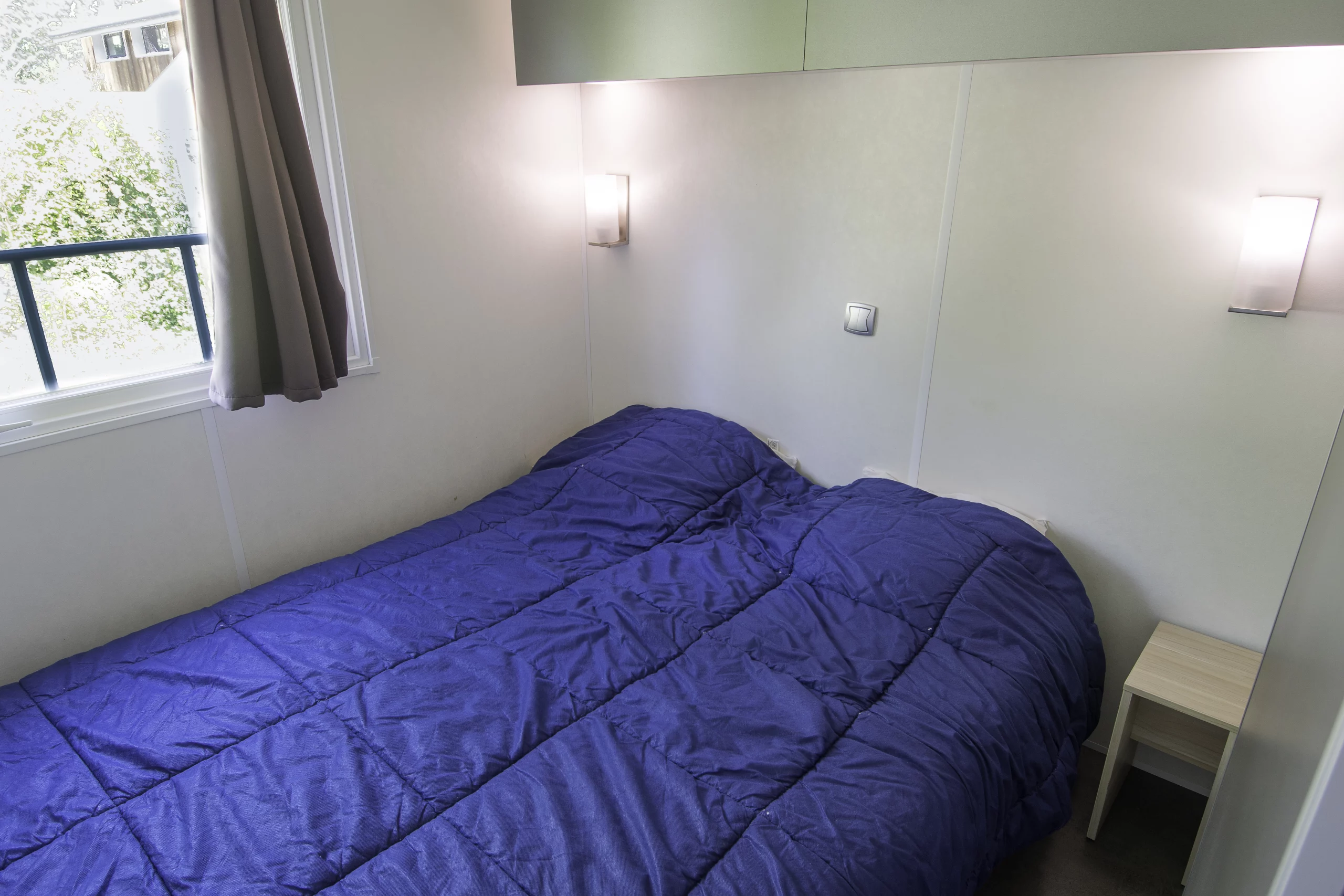 La chambre parentale dispose d’un lit en 140 et l’autre chambre comprend deux lits en 80. Les couettes et les taies d’oreiller sont comprises. La salle de douche comprend une vasque, un miroir et des rangements. Les toilettes sont séparées et disposent d’un kit ménage.