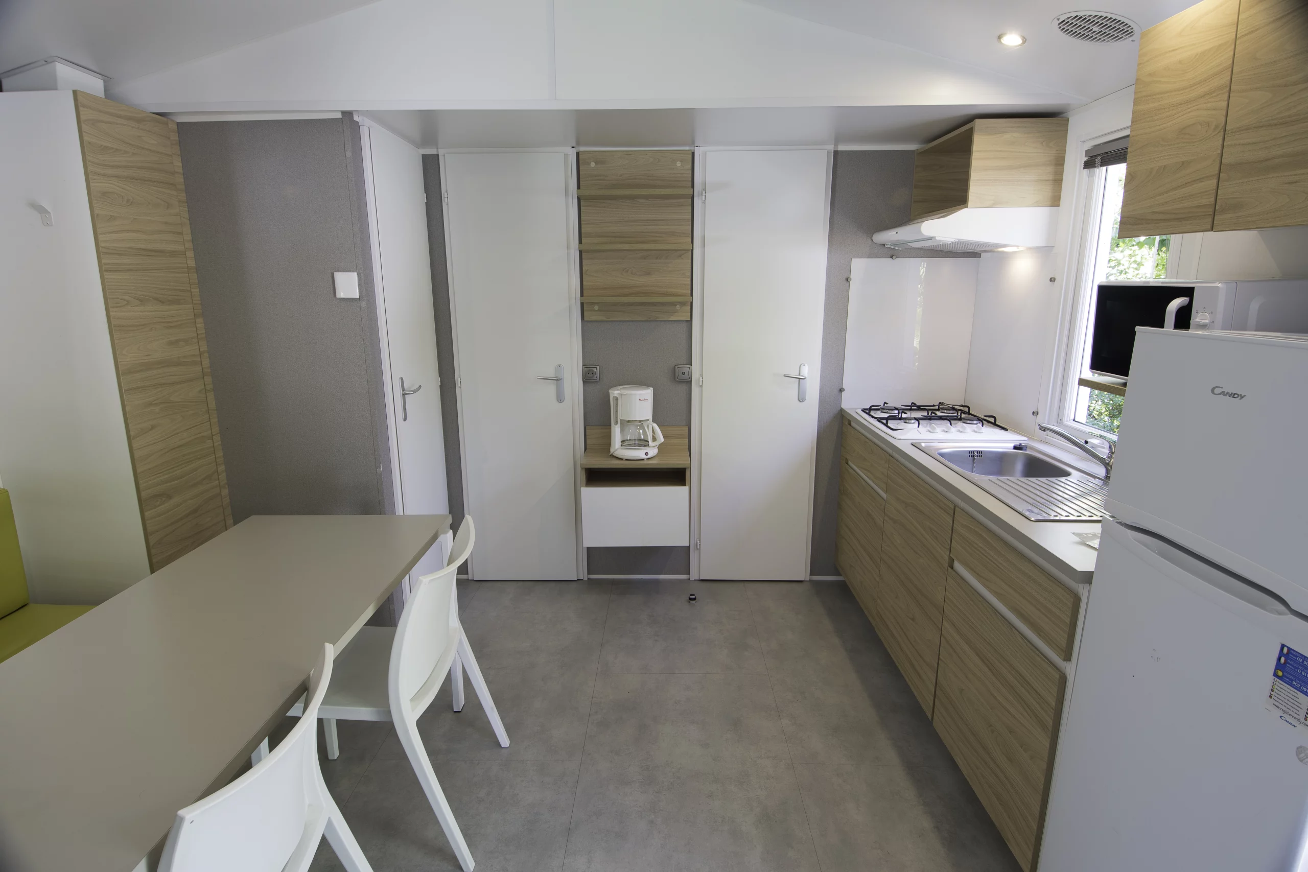 Le coin cuisine / séjour comprend un canapé d’angle avec table centrale, un plan de travail, une plaque 4 feux à gaz, un réfrigérateur avec congélateur, un micro-ondes, une cafetière électrique ainsi que des meubles de rangement comprenant les ustensiles de cuisine.