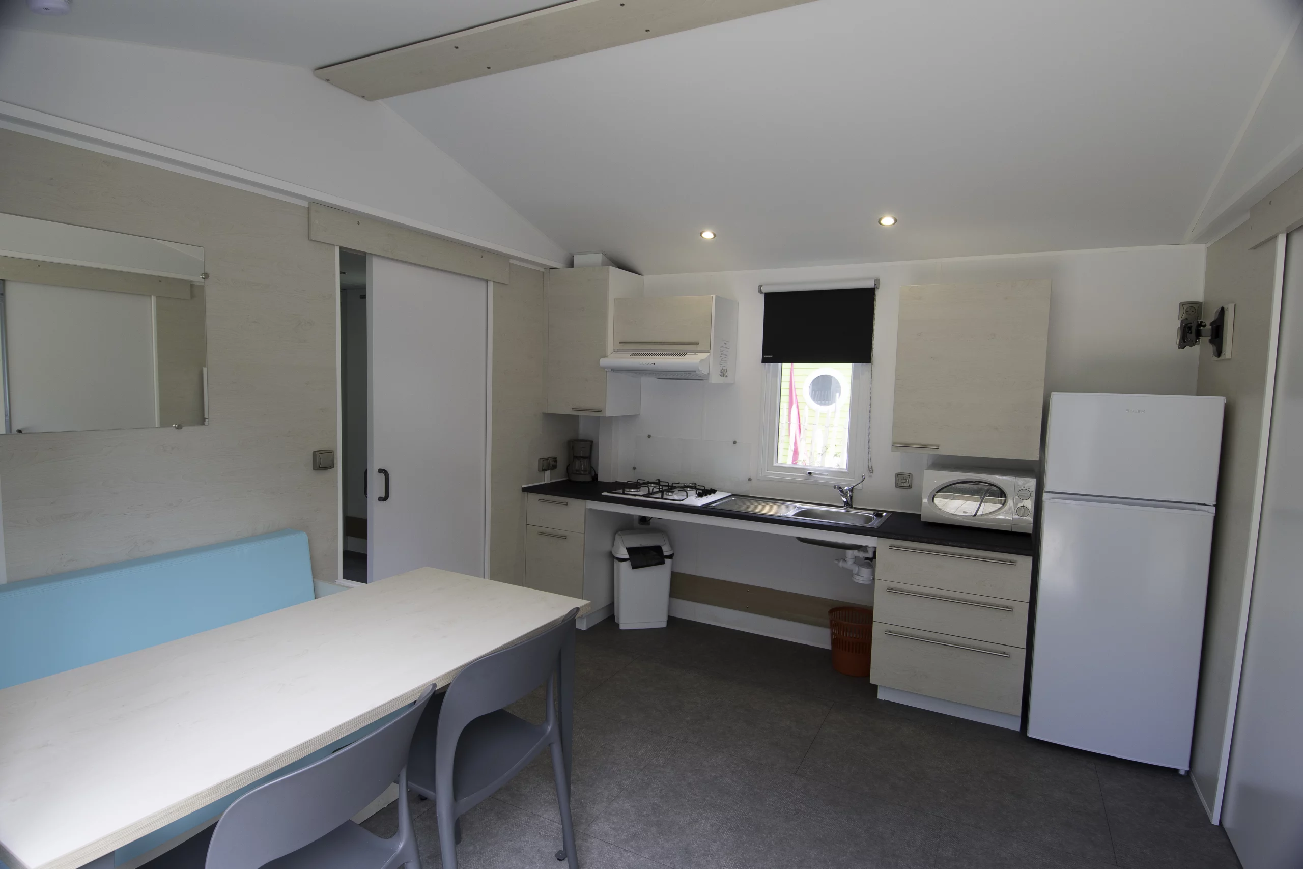 L’espace proposé permet une circulation fluide au sein de l’hébergement. L’hébergement est équipé d’un séjour avec coin repas ouvert sur la cuisine, comprenant : vaisselle, cafetière, micro-ondes, évier avec mitigeur, réfrigérateur-congélateur, plaque deux feux à gaz et placards. Les chambres comprennent un lit de 140 et 2 lits en 80 avec leurs couvertures et taies d’oreiller. Une salle et de douche et des toilettes complètent l’hébergement.