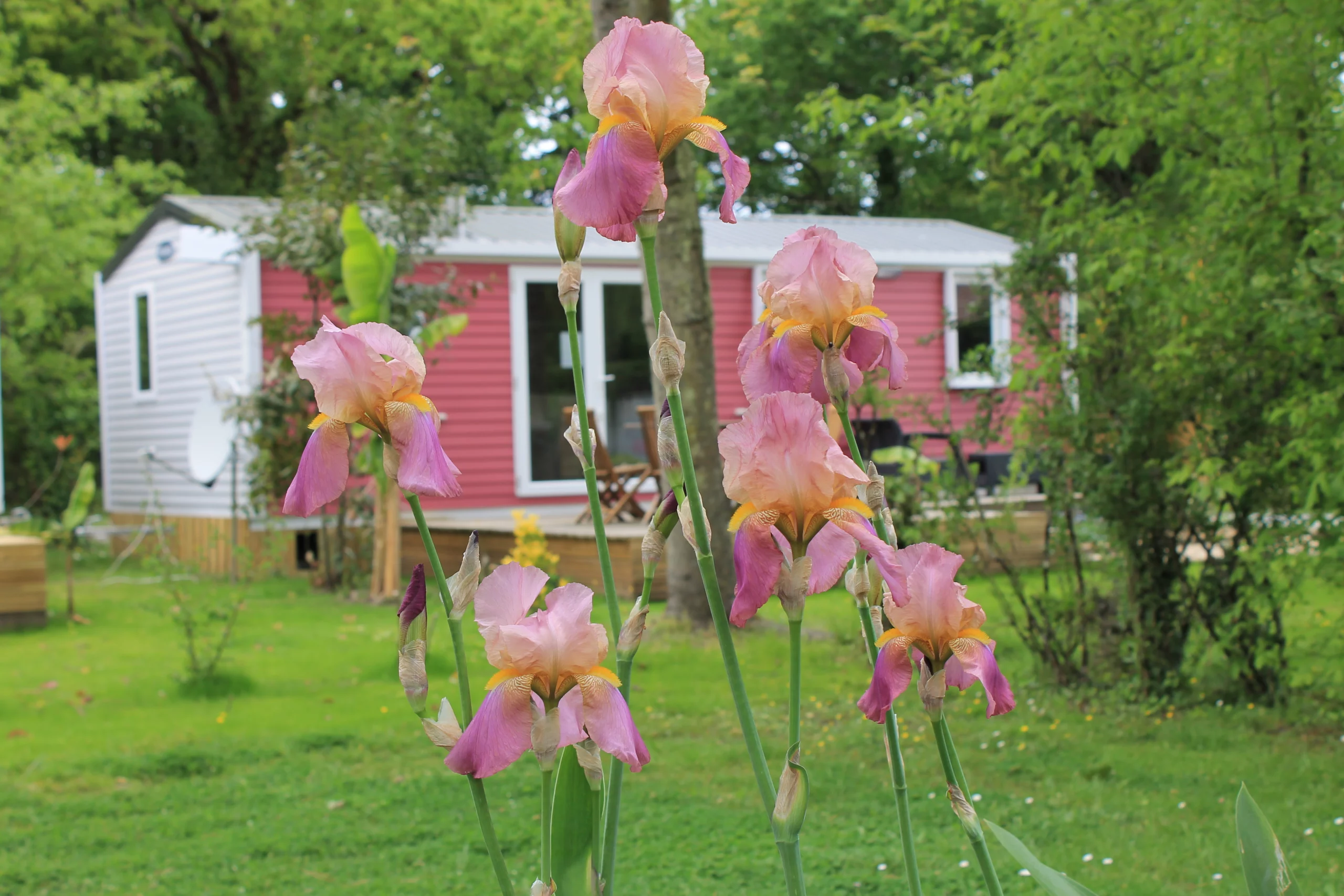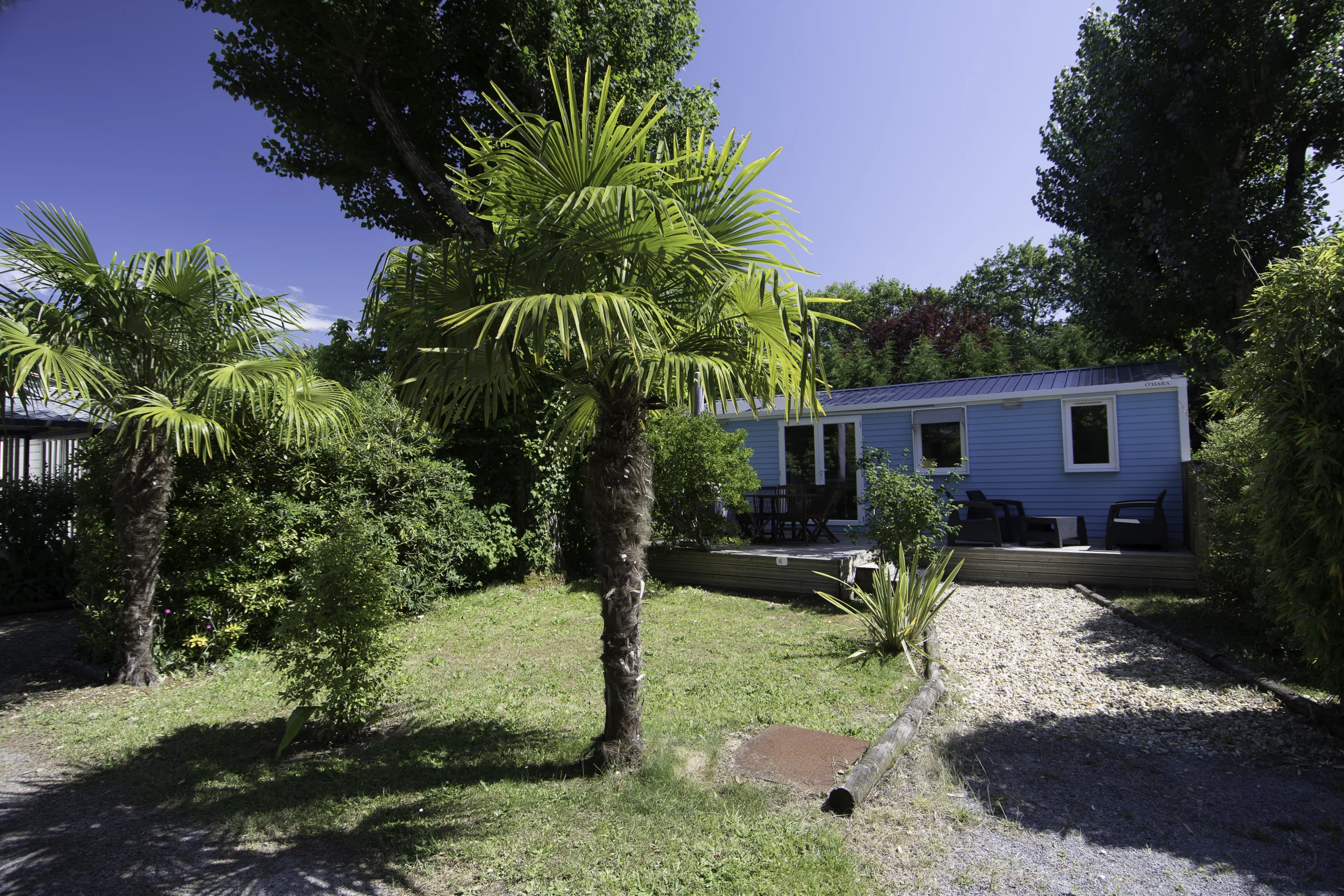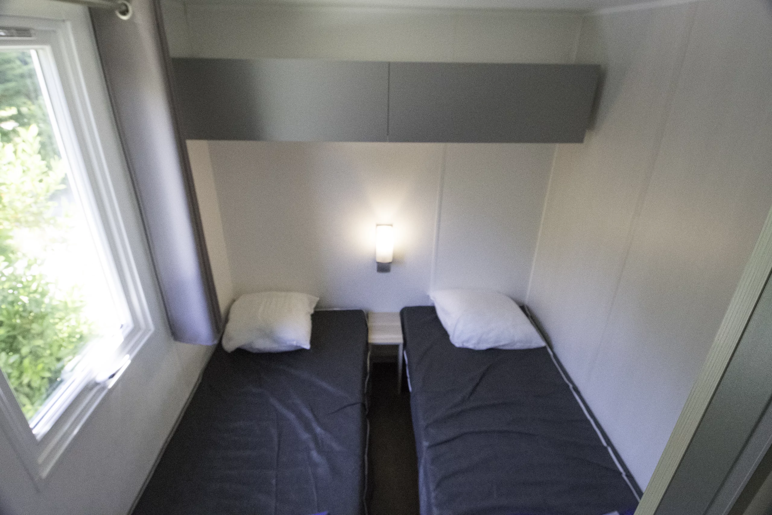 Les trois chambres disposent de couettes et d’oreillers : un lit en 140 et quatre lits en 80. La salle d’eau est aménagée et les toilettes sont séparées. Le luxe du mobil-home pour plus de confort.