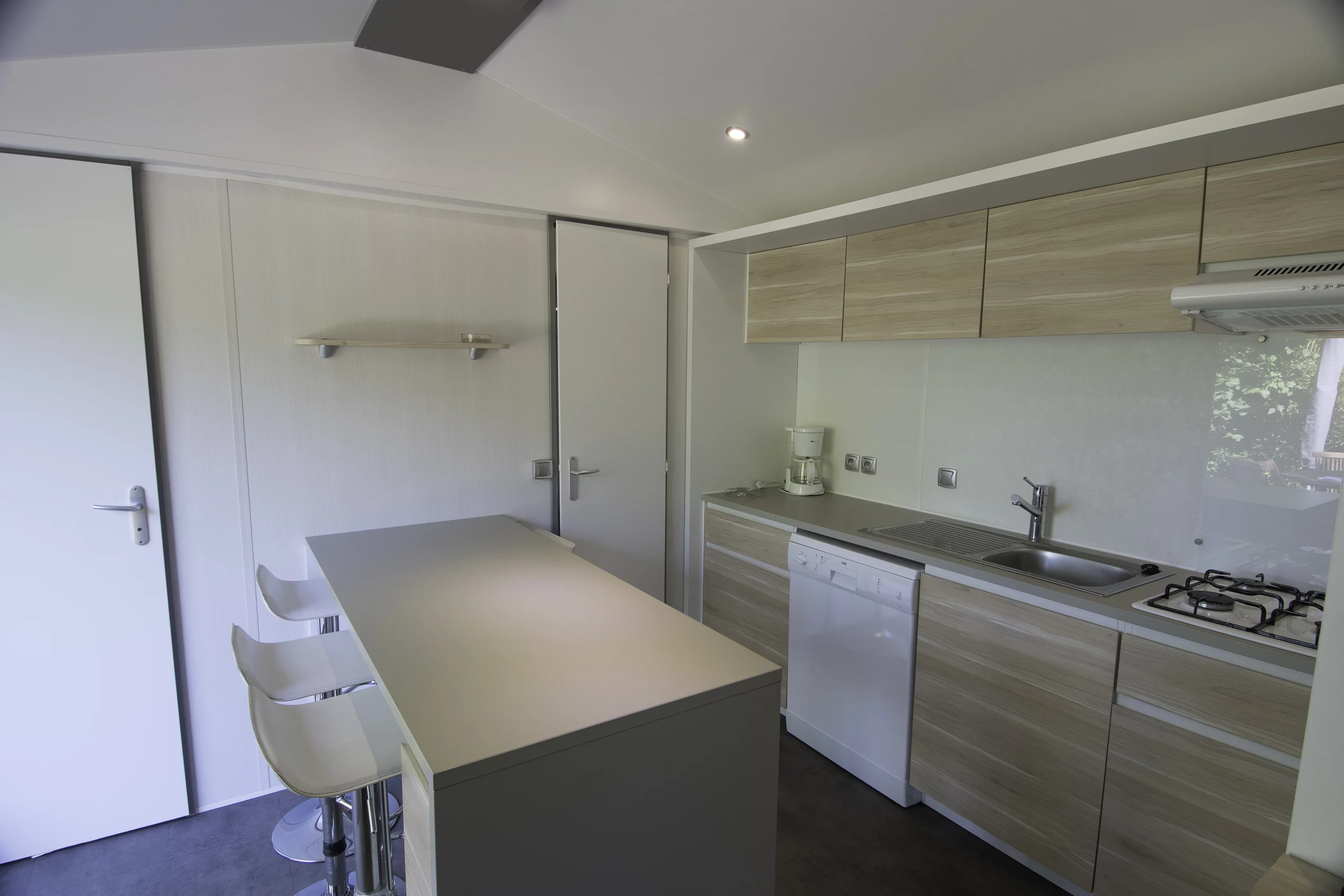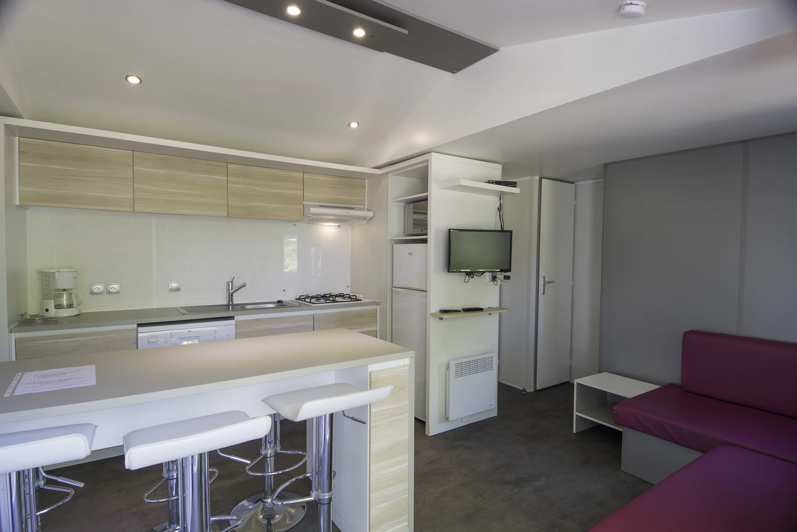 L’intérieur comprend une table haute avec ses tabourets de bar. La cuisine est équipée d’un lave-vaisselle, d’une cafetière, d’un micro-ondes, d’un réfrigérateur avec congélateur, d’une plaque de cuisson 4 feux à gaz, ainsi que d’une hotte aspirante et de tout le nécessaire pour cuisiner. Cette cuisine est ouverte sur le salon avec télévision et canapé d’angle.