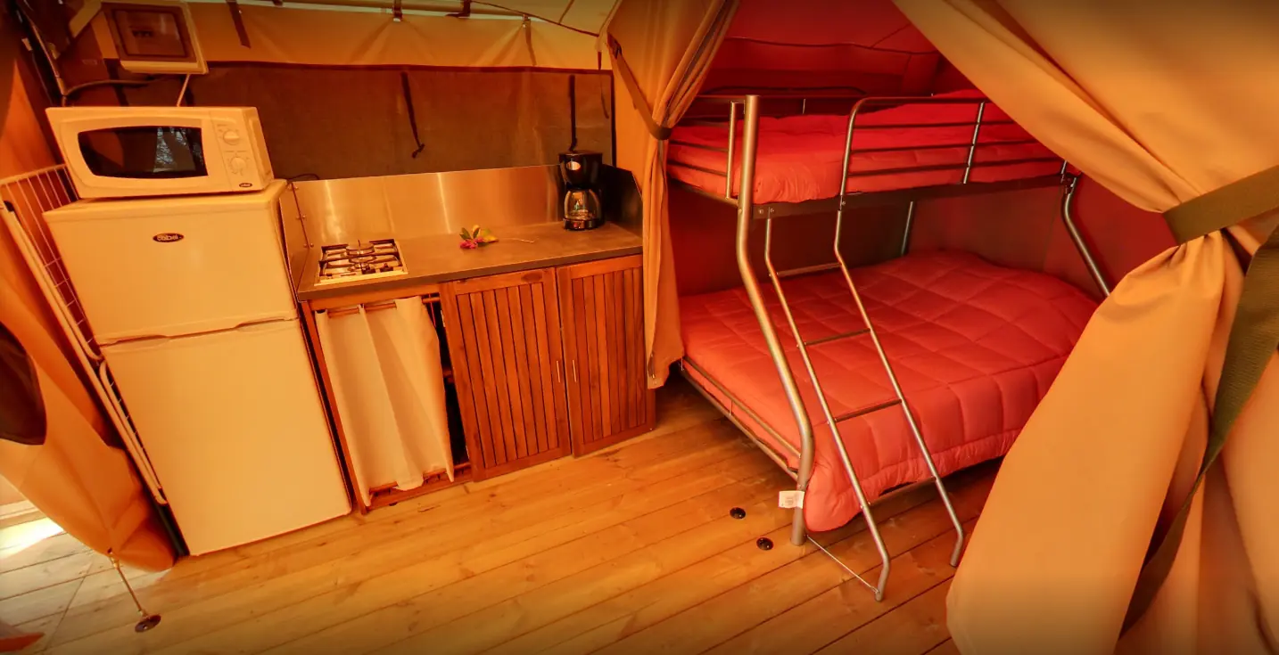 Le coin cuisine / séjour est composé d’un plan de travail, d’une plaque 2 feux à gaz, d’un réfrigérateur avec congélateur, un micro-ondes, une cafetière et des rangements. Le tout optimisé par l’éclairage, les branchements électriques, le kit vaisselle et le kit ménage.